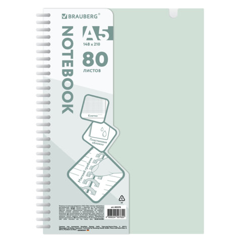 Тетрадь обложка пластик, А5 80 л., гребень мягкий, вырубка для ручки, клетка, BRAUBERG, светло-зеленый, 405378