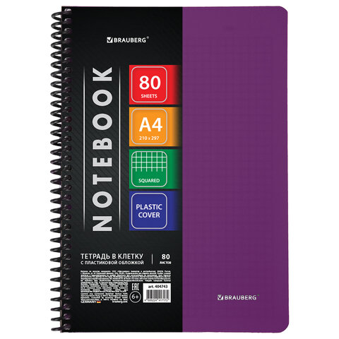Тетрадь обложка пластик, А4, 80 л., спираль пластик, клетка, BRAUBERG "Metropolis", фиолетовый, 404743