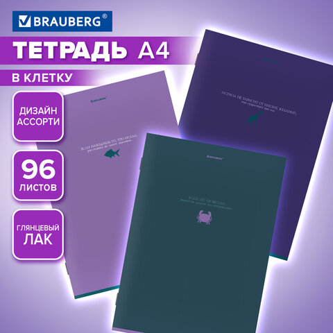 Тетрадь А4, 96 л., BRAUBERG, скоба, клетка, глянцевый лак, "Monocolor", (микс в спайке), 405322