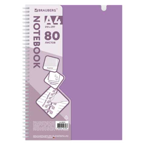 Тетрадь обложка пластик, А4 80 л., гребень мягкий, вырубка для ручки, клетка, BRAUBERG, сиреневый, 405374
