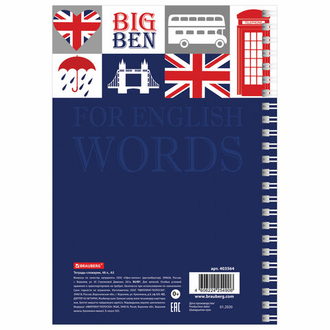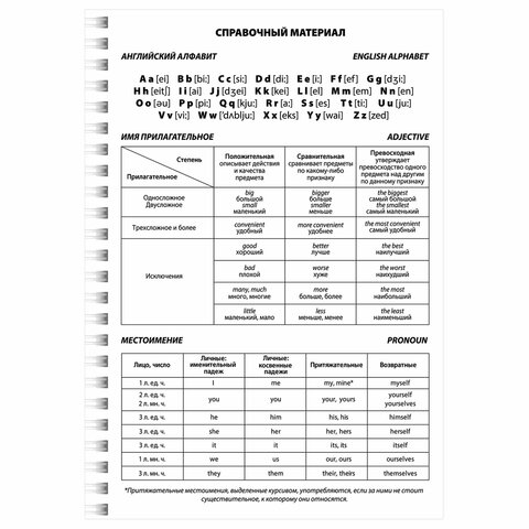 Тетрадь-словарь для записи английских слов А5 48 л., гребень, клетка, BRAUBERG, справка, 403564