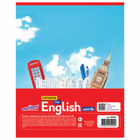 Тетрадь-словарь для записи английских слов А5 48 л., скоба, клетка, ЮНЛАНДИЯ, справка, 403566