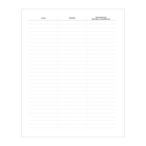 Предназначена для записи изученных слов, их повторения и самопроверки. На первой странице размещен алфавит, последних восьми - грамматический материал. Каждая страница словарика поделена на части для удобства ведения записей.