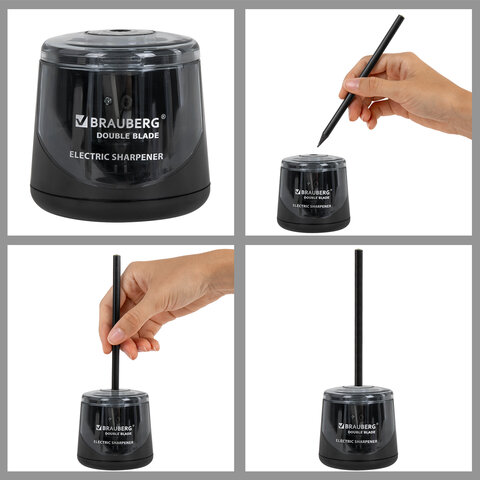 Электрическая точилка BRAUBERG DOUBLE BLADE BLACK с контейнером для сбора стружки и прямым двойным лезвием, работает от 2 батареек АА (в комплект не входят). Предназначена для затачивания деревянных и пластиковых карандашей диаметром 6-8 мм.