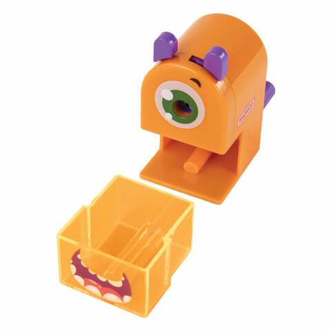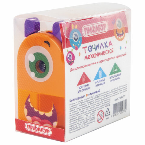 Точилка механическая ПИФАГОР "Монстрик", корпус оранжевый, для чернографитных и цветных карандашей, 228477