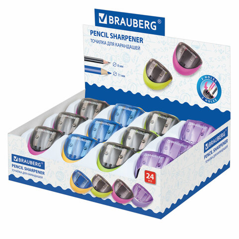 Точилка BRAUBERG "Space", 2 отверстия для чернографитных карандашей (в том числе утолщенных), резиновый упор, с контейнером, ассорти, 223589