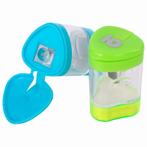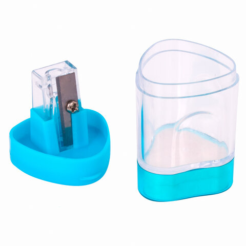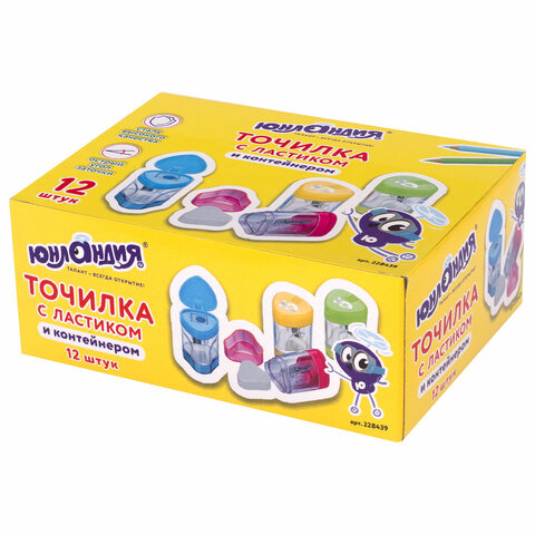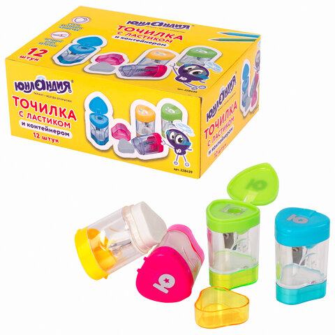Точилка ЮНЛАНДИЯ "Трио +", со стирательной резинкой, с контейнером, пластиковая, ассорти, 228439