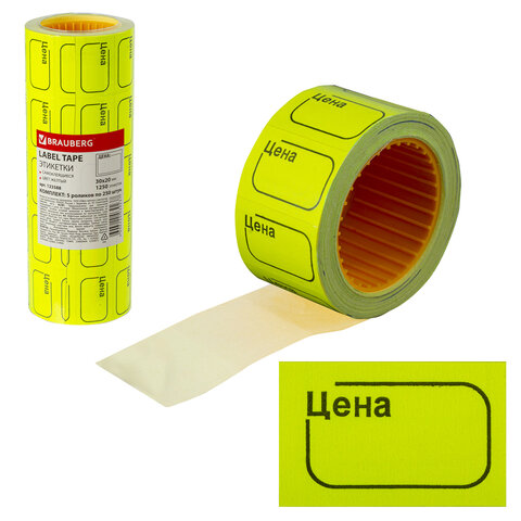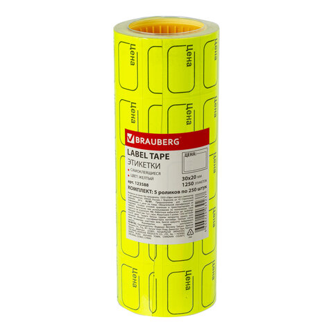 Ценник малый "Цена" 30х20 мм, желтый, самоклеящийся, КОМПЛЕКТ 5 рулонов по 250 шт., BRAUBERG, 123588