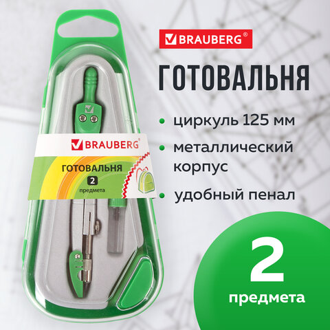 Металлическая готовальня BRAUBERG "Klasse" предназначена для выполнения чертежных работ. Для учеников младших и средних классов.
