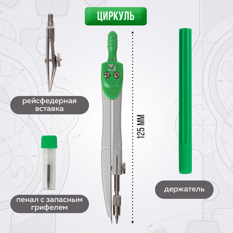 Готовальня BRAUBERG "Klasse", 4 предмета: циркуль 125 мм, рейсфедерная вставка + держатель, грифель, 210334