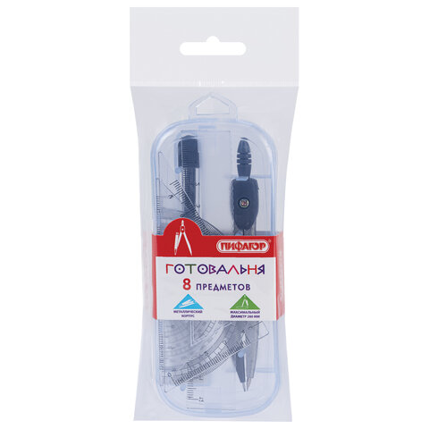 Готовальня ПИФАГОР 8 предметов: циркуль 120 мм, чертежные принадлежности, пластиковый пенал, 210860