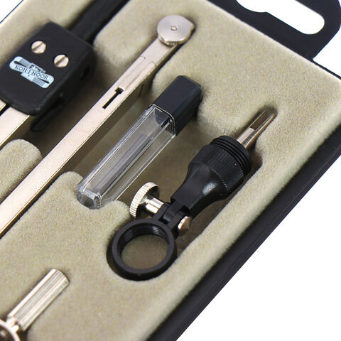 Готовальня в пластиковом пенале с прозрачной крышкой. Наполнение – 6 предметов.
