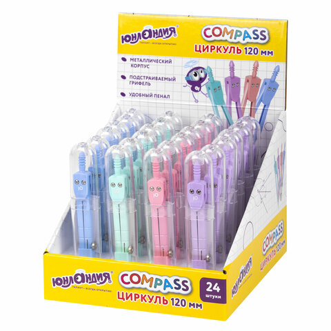 Циркуль ЮНЛАНДИЯ 120 мм, металлический, пастельные цвета ассорти, защитный колпачок, пластиковый пенал, дисплей, 210688