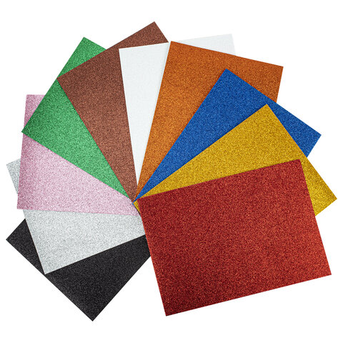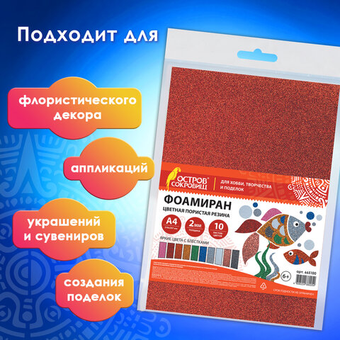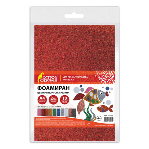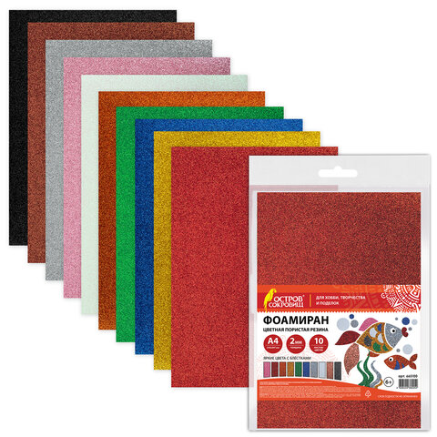 Пористая резина/фоамиран А4, 2 мм, НАБОР, 10 листов, 10 цветов, яркие цвета, блестки, ОСТРОВ СОКРОВИЩ, 665100