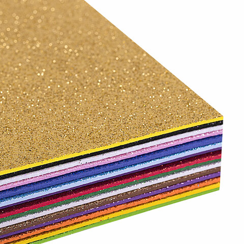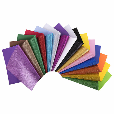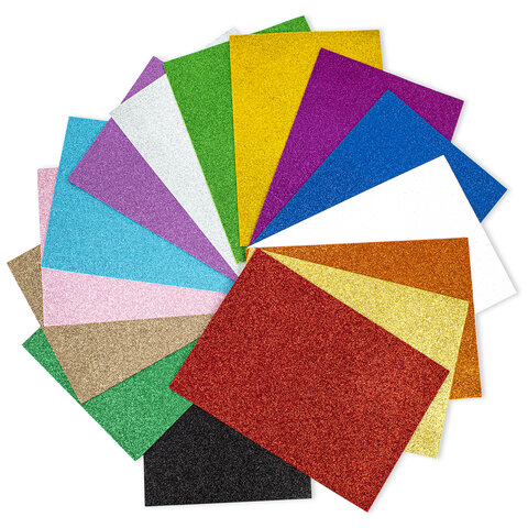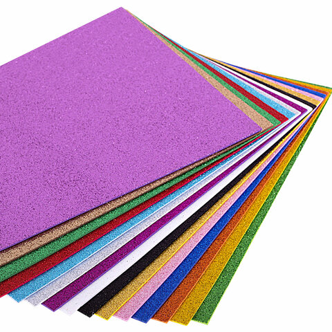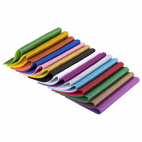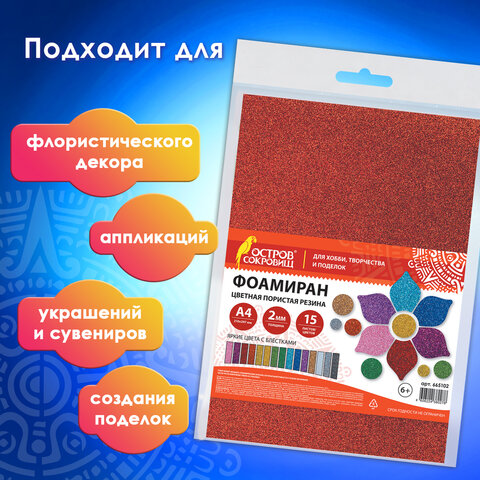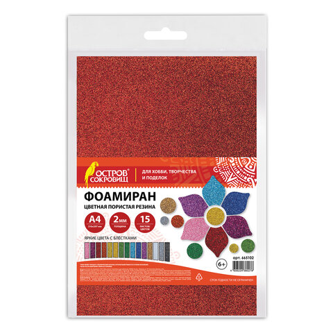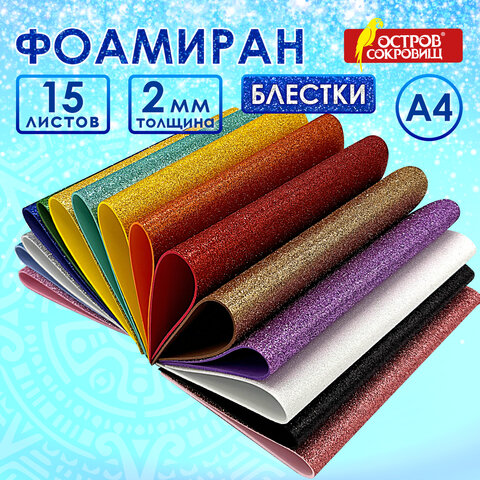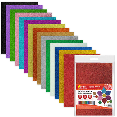 Пористая резина/фоамиран А4, 2 мм, НАБОР, 15 листов, 15 цветов, яркие цвета, блестки, ОСТРОВ СОКРОВИЩ, 665102