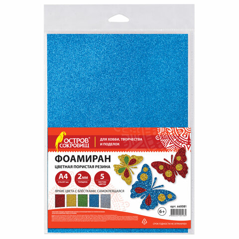 Пористая резина/фоамиран А4, 2 мм, НАБОР, 5 листов, 5 цветов, яркие цвета, блестки, самоклеящаяся, ОСТРОВ СОКРОВИЩ, 660081