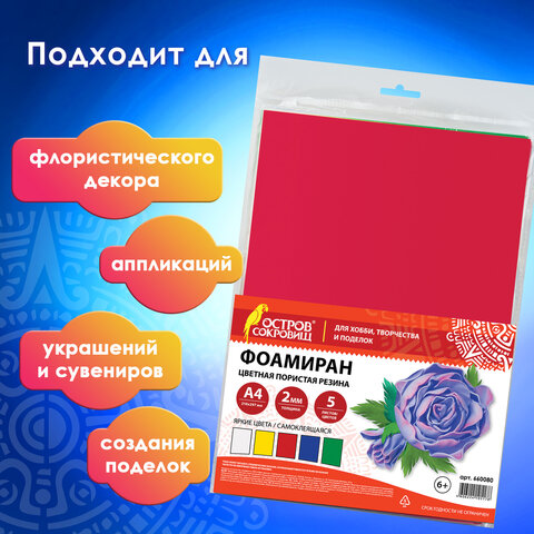 Пористая резина/фоамиран А4, 2 мм, НАБОР, 5 листов, 5 цветов, яркие цвета, самоклеящаяся, ОСТРОВ СОКРОВИЩ, 660080