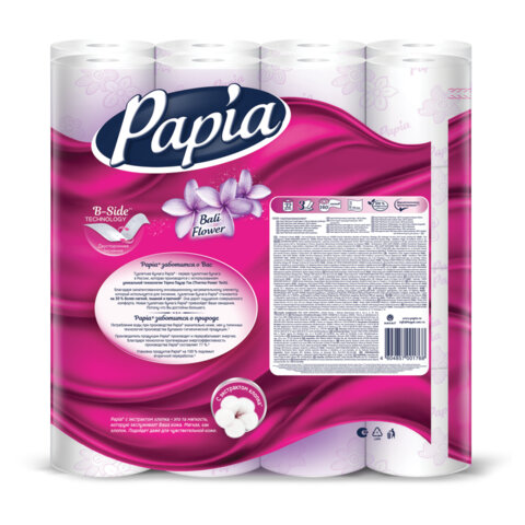 Ароматизированная трехслойная туалетная бумага PAPIA "Балийский цветок" с цветным тиснением и перфорацией. Технология двустороннего тиснения бумаги обеспечивает лучшую впитываемость.