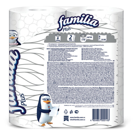 Бумага туалетная бытовая, спайка 4 шт., 2-слойная (4х20,4 м), FAMILIA PLUS, белая, 5080758