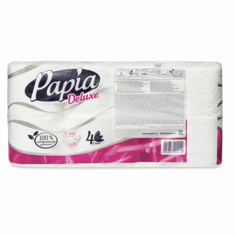 Бумага туалетная бытовая, спайка 8 шт., 4-слойная (8х16 м), PAPIA DELUXE, белая, 5080737