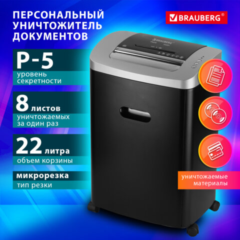 Уничтожитель (шредер) BRAUBERG JP822M, CD, 5 уровень секретности, 2х12 мм, 8 листов, корзина 22 литра, 532591