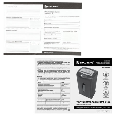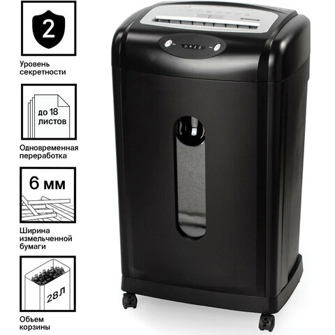 Уничтожитель (шредер) BRAUBERG S18-S, БЕСШУМНЫЙ, 2 уровень секретности, полоски 6 мм, 18 листов, корзина 28 литров, 530961