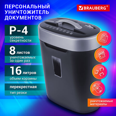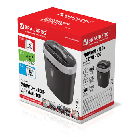 Уничтожитель (шредер) BRAUBERG S8, 4 уровень секретности, фрагменты 4х18 мм, 8 листов, корзина 16 литров, CD, 530962