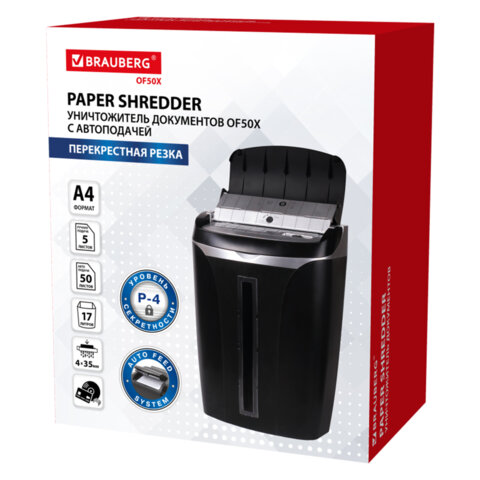 Уничтожитель (шредер) с автоподачей BRAUBERG AUTO OF-50X, CD, 4 уровень секретности, 4х35 мм, 50 листов, 17 литров, 533139