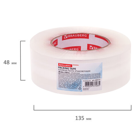 Клейкая лента упаковочная 48 мм х 200 м, прозрачная, толщина 45 микрон, BRAUBERG ORIGINAL, 440177
