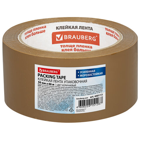 Клейкая лента упаковочная, 50 мм х 66 м, КОРИЧНЕВАЯ, УСИЛЕННАЯ, МОРОЗОСТОЙКАЯ, толщина 50 микрон, BRAUBERG, 440113
