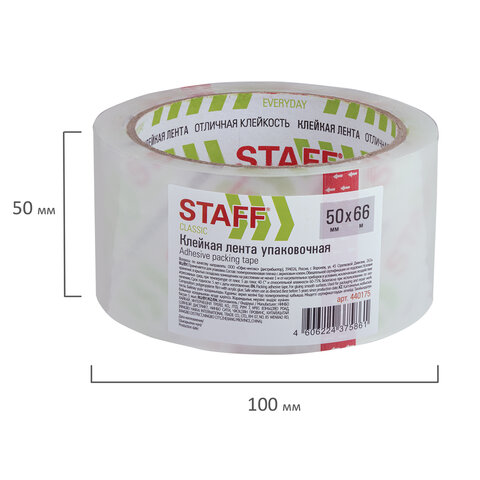 Клейкая лента упаковочная 50 мм x 66 м, прозрачная, толщина 40 микрон, STAFF CLASSIC, 440175