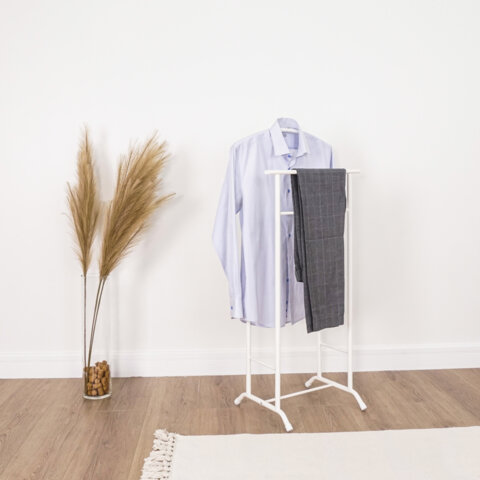 Вешалка напольная для одежды индивидуального пользования. Подходит для хранения одежды, ее сушки и отпаривания. Вместительная за счет плечиков и штанг. Компактность и функциональность позволяют ее эксплуатацию дома, в офисе, гостиницах и кафе.