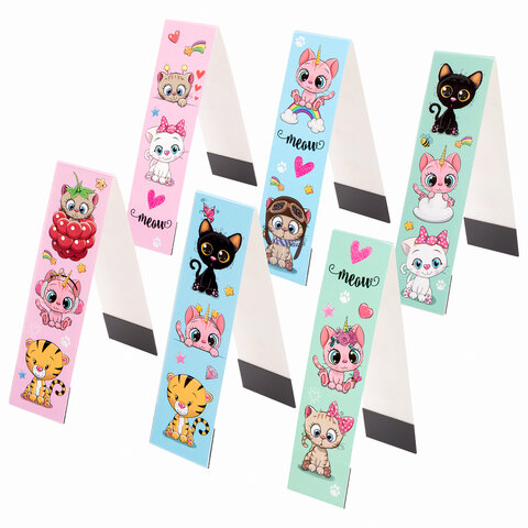 Закладки для книг с магнитом MEOW CATS, набор 6 шт., блестки, 25x196 мм, ЮНЛАНДИЯ, 113442