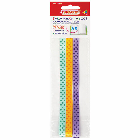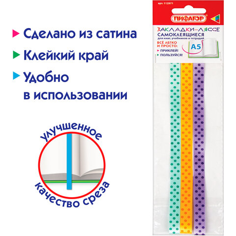 Закладки-ляссе фактурные для книг А5 (длина 28 см) "ФАНТАЗИЯ", клейкий край, 3 ленты, ПИФАГОР, 112971