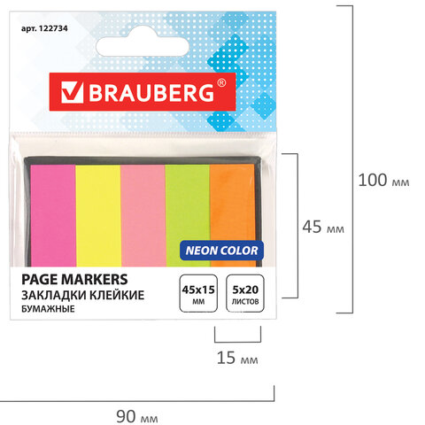 Закладки клейкие неоновые BRAUBERG бумажные, 45х15 мм, 100 штук (5 цветов х 20 листов), в картонной книжке, 122734