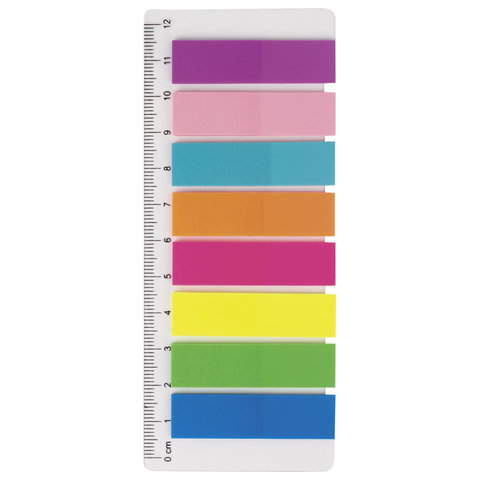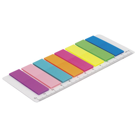 Закладки клейкие неоновые BRAUBERG, 45х12 мм, 200 штук (8 цветов х 25 листов), на пластиковой линейке 12 см, 126700