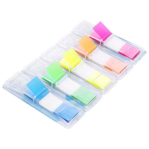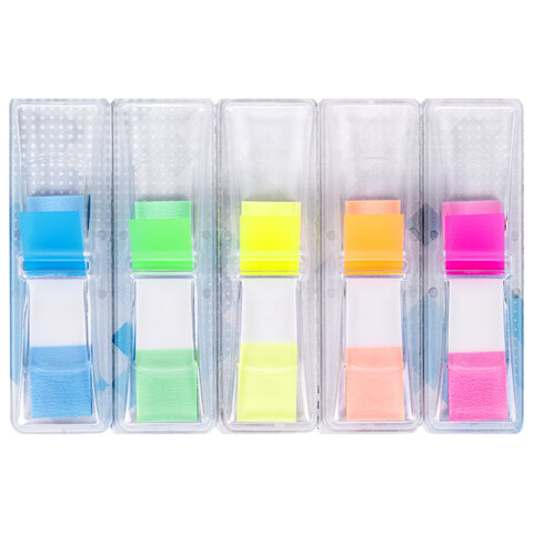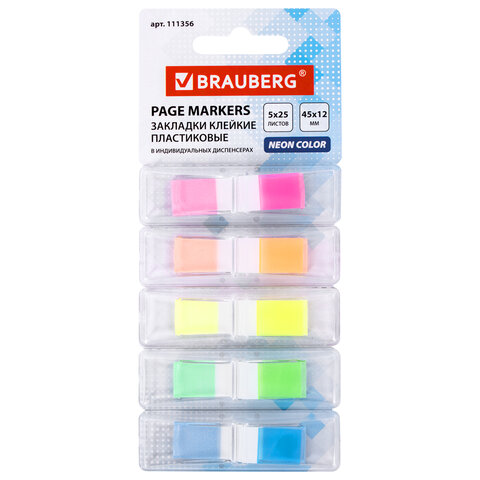 Закладки клейкие неоновые BRAUBERG, 45х12 мм, 125 штук (5 цветов х 25 листов), в пластиковых диспенсерах, 111356