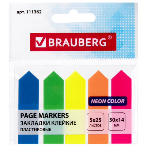 Закладки клейкие неоновые BRAUBERG "СТРЕЛКИ", 50х14 мм, 125 штук (5 цветов х 25 листов), 111362