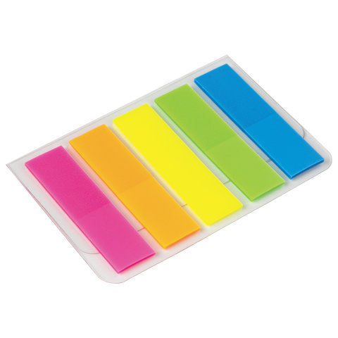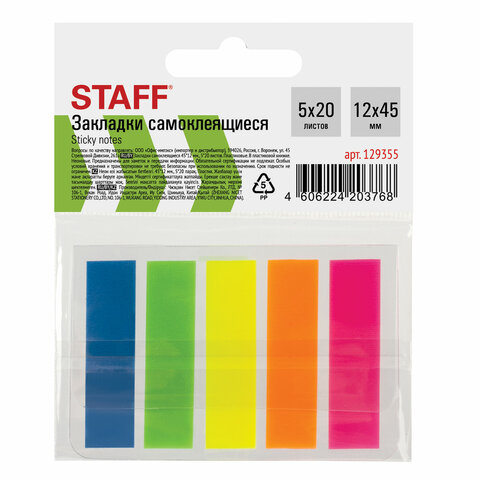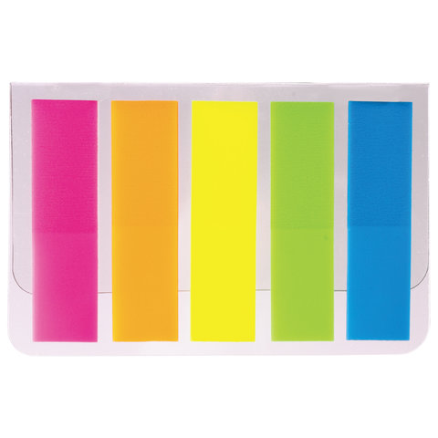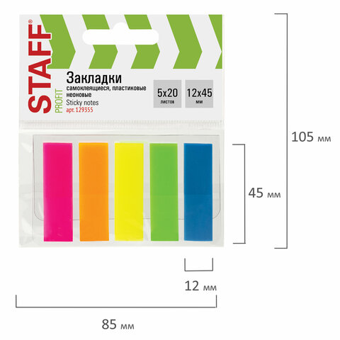 Закладки клейкие неоновые STAFF, 45х12 мм, 100 штук (5 цветов х 20 листов), на пластиковом основании, 129355