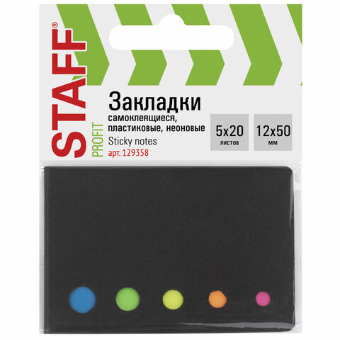 Закладки клейкие неоновые STAFF "СТРЕЛКИ", 50х12 мм, 100 штук (5 цветов х 20 листов), в картонной книжке, 129358