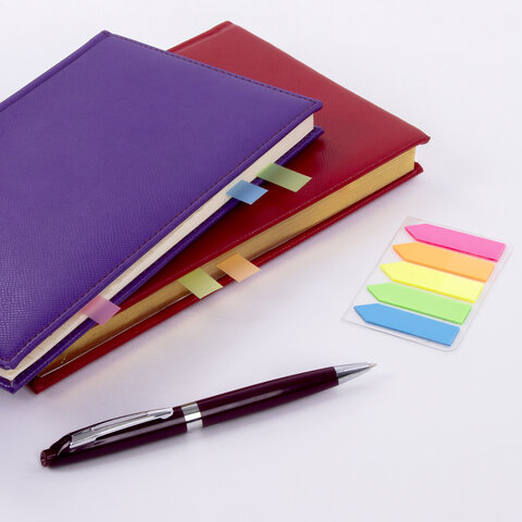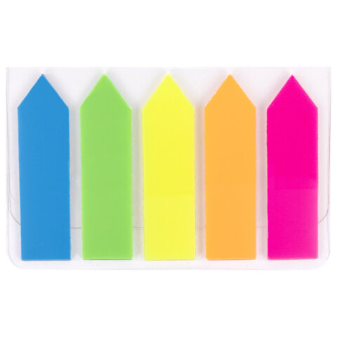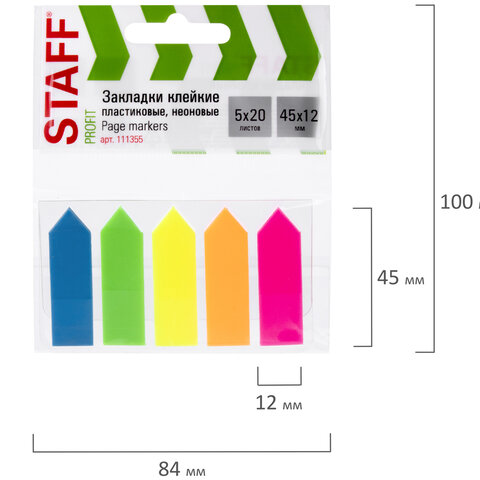 Закладки клейкие неоновые STAFF "СТРЕЛКИ", 45х12 мм, 100 штук (5 цветов х 20 листов), на пластиковом основании, 111355