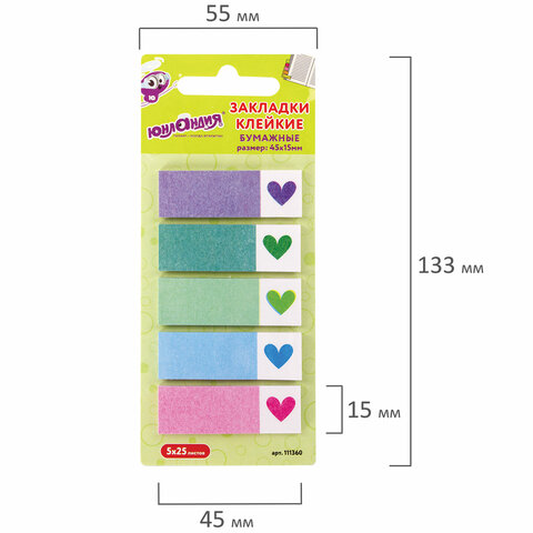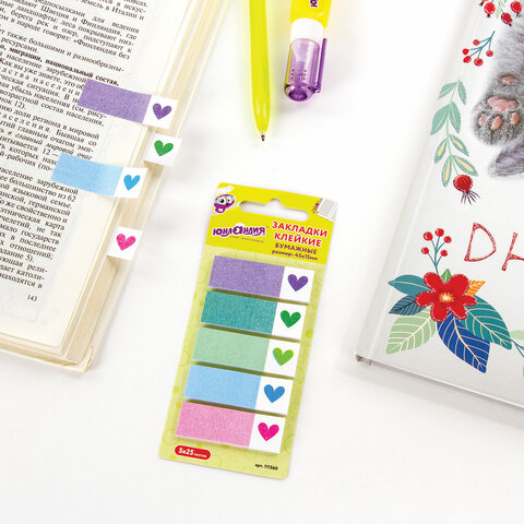 Закладки клейкие ЮНЛАНДИЯ бумажные "Сердечки", 45х15 мм, 125 штук (5 цветов х 25 листов), 111360