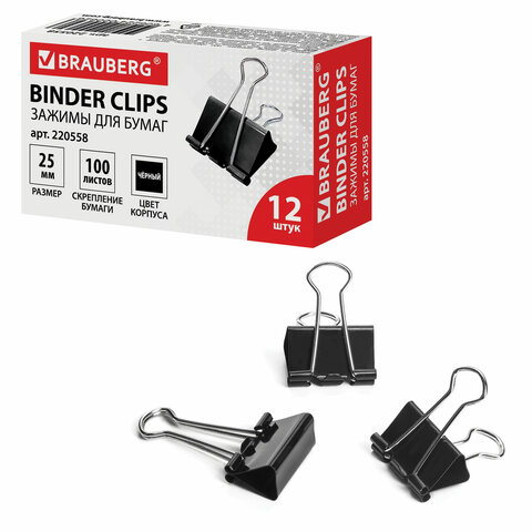 Зажимы для бумаг BRAUBERG, КОМПЛЕКТ 12 шт., 25 мм, на 100 листов, черные, картонная коробка, 220558