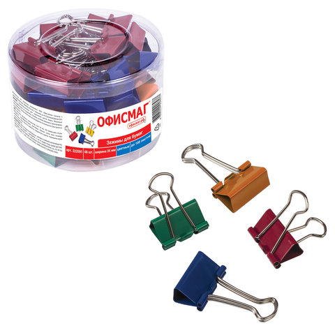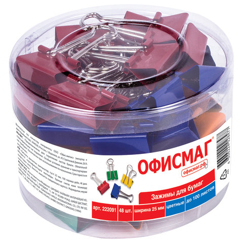 Зажимы для бумаг ОФИСМАГ, КОМПЛЕКТ 48 шт., 25 мм, на 100 листов, цветные, в пластиковом цилиндре, 222091