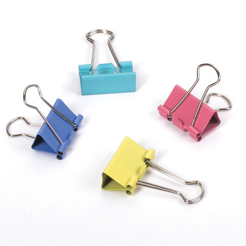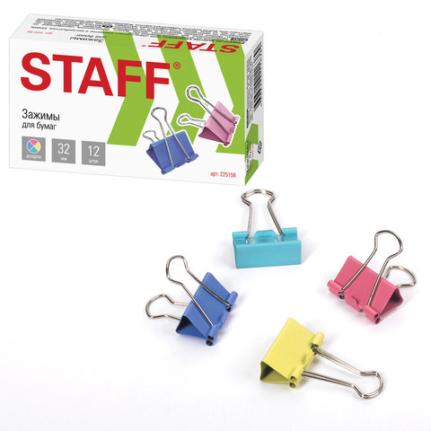 Зажимы для бумаг STAFF "Profit", КОМПЛЕКТ 12 шт., 32 мм, на 140 листов, цветные, картонная коробка, 225158
