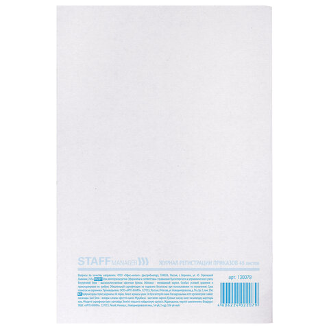 Журнал регистрации приказов, 48 л., картон, блок офсет, А4 200х290 мм, STAFF, 130079