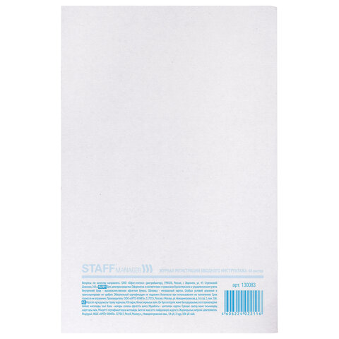 Журнал регистрации вводного инструктажа, 48 л., картон, блок офсет, А4 200х290 мм, STAFF, 130083